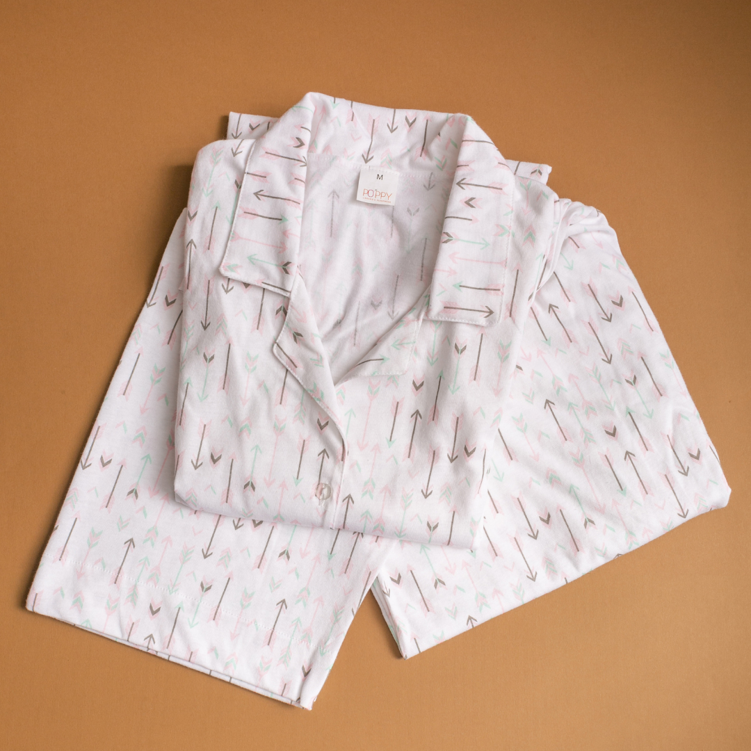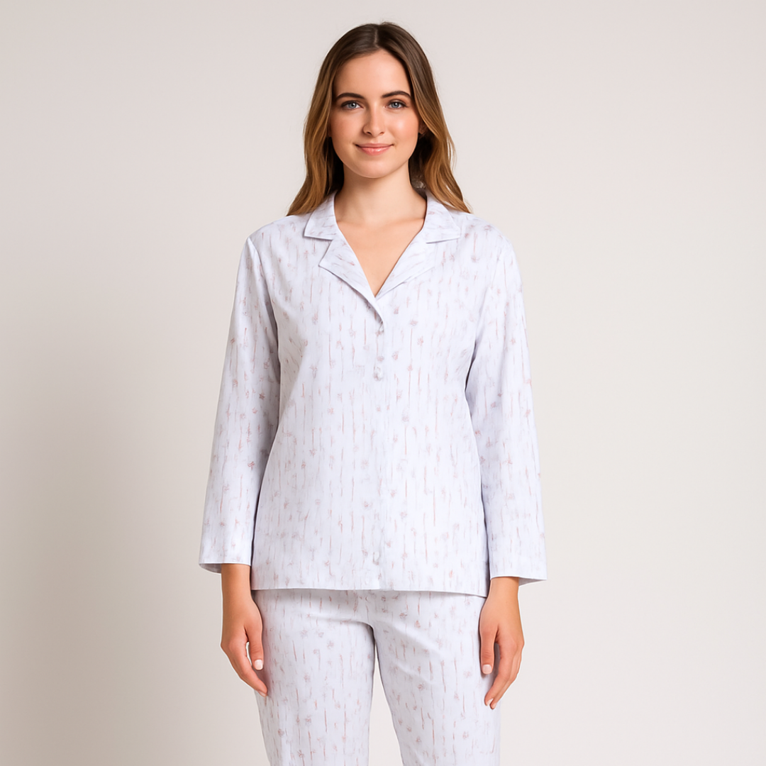 Crafted from lightweight, breathable fabric, the set features a long-sleeve top with a collared neckline and a relaxed fit. The matching full-length pants are tailored with a straight cut offering both style and comfort.
