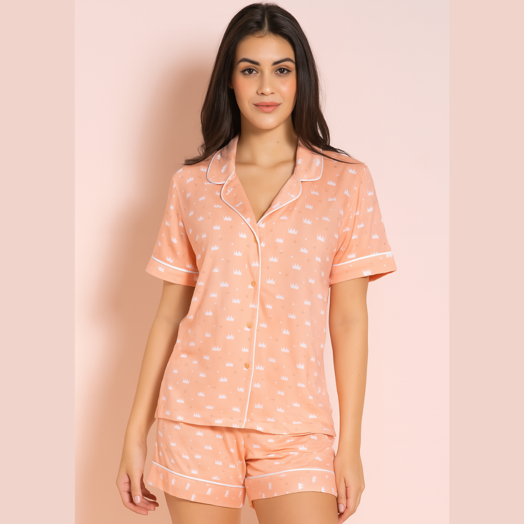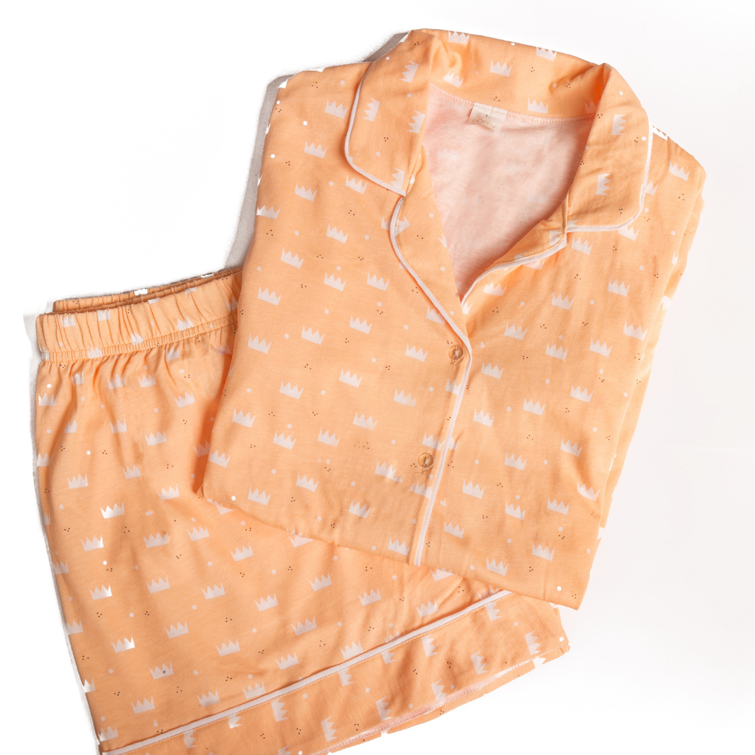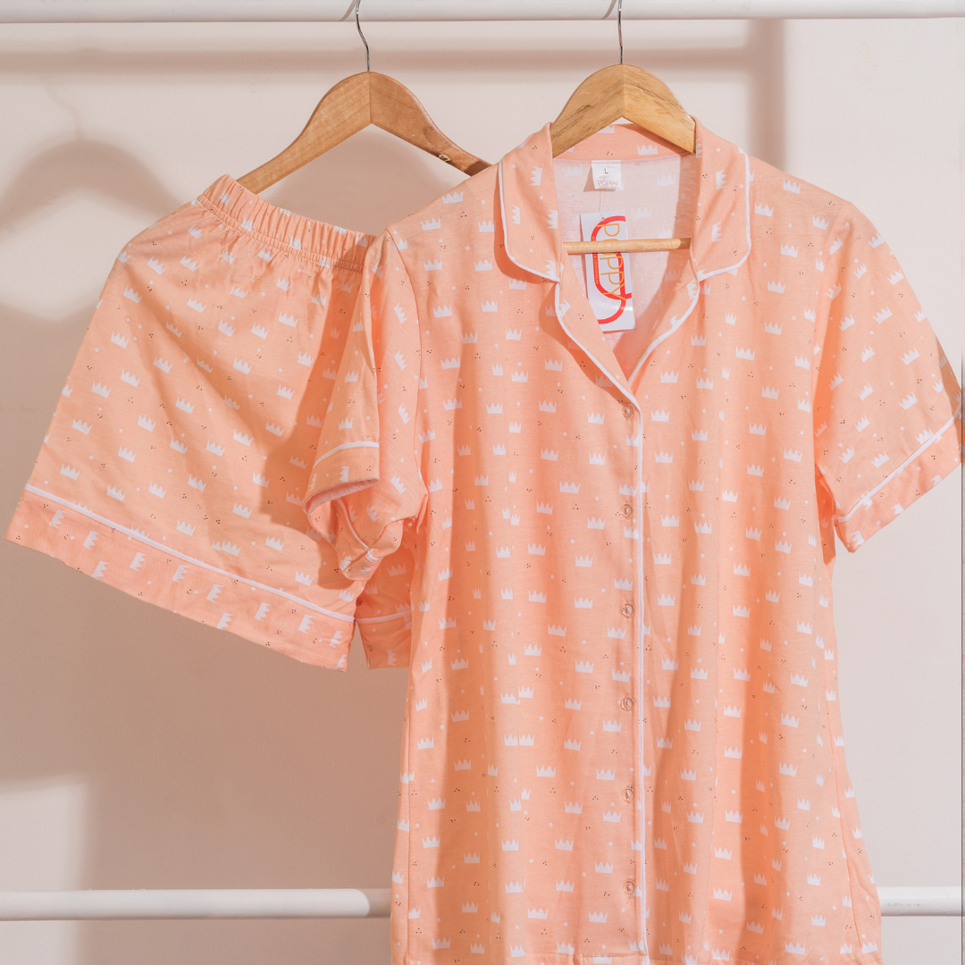 The playful all-over crown print cotton set adds a fun, feminine touch, while the delicate white piping enhances the chic, tailored finish.
